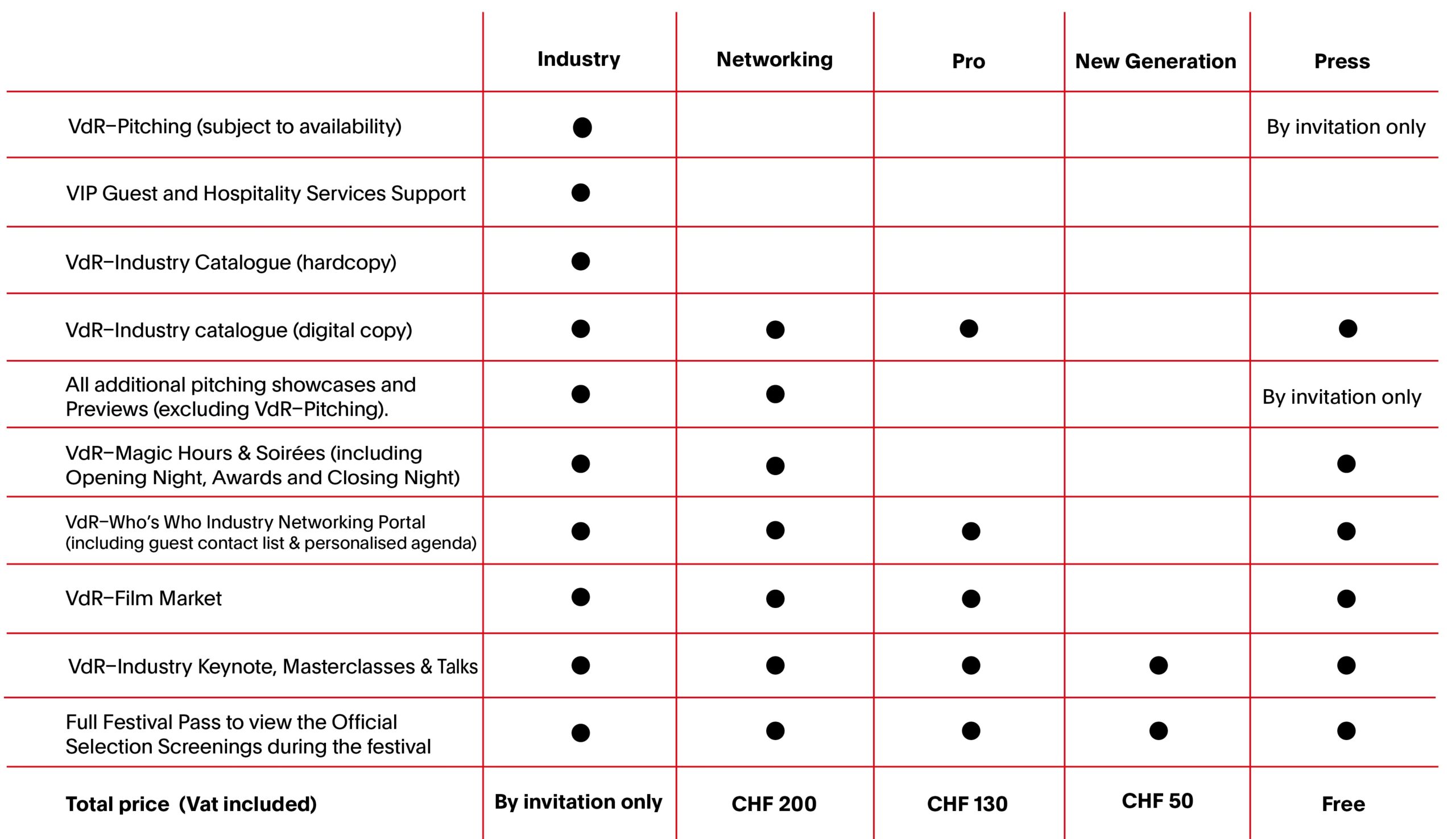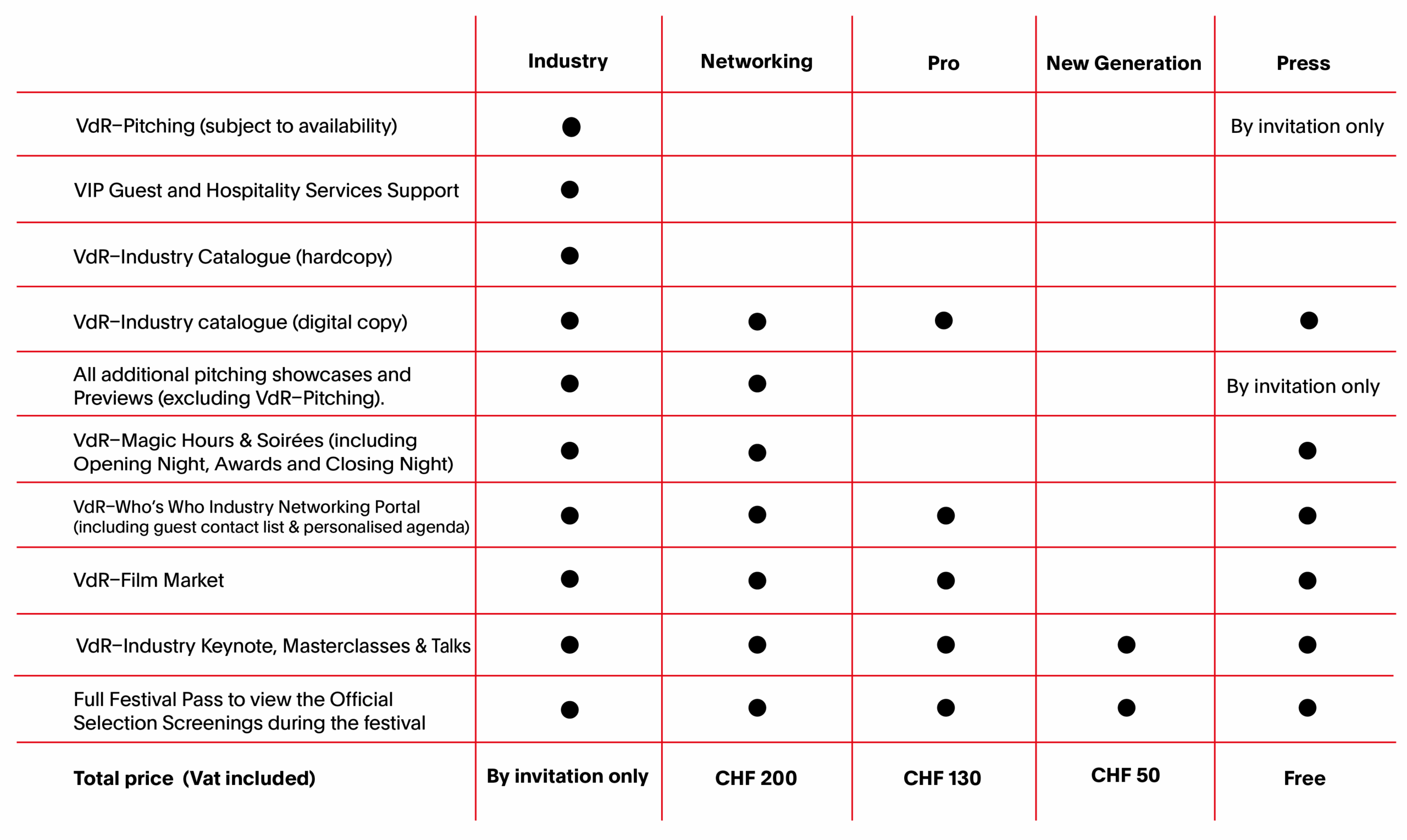 The PRESS accreditation is free, but it is only available to journalists who can guarantee media coverage of the Festival and the VdR–Industry programme. Proof of media affiliation is required when applying.