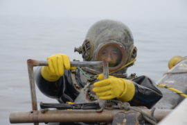Après My Love Don’t Cross that River (VdR, 2015), Moyoung Jin continue d'explorer la Corée contemporaine et nous plonge dans le quotidien d'une famille au destin extraordinaire. Onze ans après avoir fui la Corée du Nord par la mer avec femme et enfants, Park Myongho continue chaque jour de risquer sa vie en plongeant pêcher le poulpe, enfermé dans un antique scaphandre de 60 kg et relié à la surface par un fragile tuyau qui lui permet de respirer. Ces incroyables combats sous-marins filmés par Moyoung Jin deviennent alors le symbole d'une lutte plus générale. Car, comme de nombreux déserteurs qui ont quitté la Corée du Nord pour tenter leur chance chez leurs voisins capitalistes, Park Myongho s'intègre difficilement et sa nouvelle vie est un combat quotidien, marqué par la peur mais aussi par un désir farouche d'améliorer sa condition. Portrait d'un homme mû par une inébranlable volonté et chronique familiale qui dessine les destins divergents de ses deux fils, Old Marine Boy nous propose une réflexion palpitante sur l'instinct de survie, la capacité d'adaptation de l'homme, et son inoxydable faculté d'espérer.